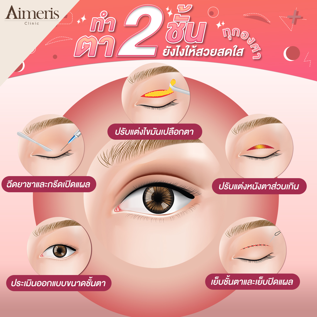A: ในการศัลยกรรมตาสองชั้นบางเทคนิคสามารถช่วยแก้ปัญหาหนังตาตก หนังตาหย่อนคล้อย หรือไขมันเยอะได้ ซึ่งหากทำตาสองชั้นพร้อมกับการตัดหนังส่วนเกิน จะช่วยลดโอกาสหนังตาตกได้ในอนาคต ทั้งยังช่วยทำให้ดวงตาดูกลมโต มีมิติ ได้ชั้นตาที่ชัดเจน เหมาะสำหรับคนที่มีปัญหาไขมันบนเปลือกตาเยอะ มีหนังตาที่ตก หย่อนคล้อย