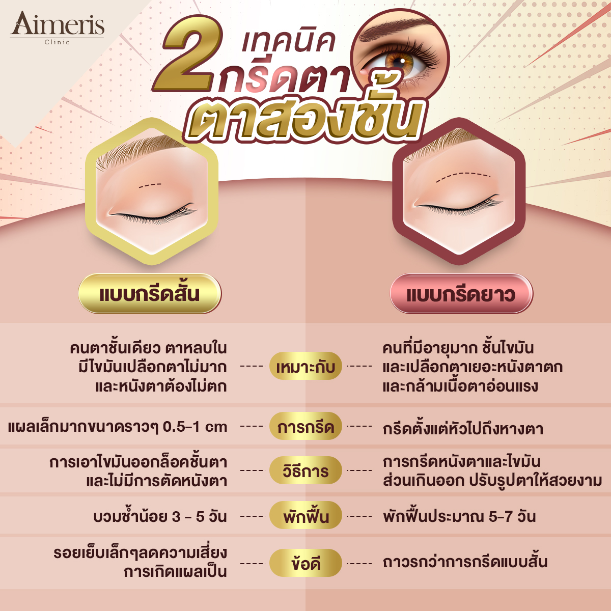 A : การกรีดตาสองชั้น เป็นการสร้างชั้นตา และเป็นการกรีดหนังตาส่วนเกิน บริเวณที่มีการหย่อนคล้อย หรือหางตาตกได้ ซึ่งการกรีดตาสองชั้นจะไม่ทำตาดูลึก แต่จะช่วยปรับรูปตาให้ดูมีมิติ มีชั้นตาที่ชัดเจนมากขึ้น ทั้งยังสามารถกำหนดความยาวของชั้นตาได้ จึงเหมาะสำหรับคนที่มีตาชั้นเดียว มีชั้นตาหลบใน หรือผู้ที่มีปัญหาหนังตาตก มีไขมันเยอะ